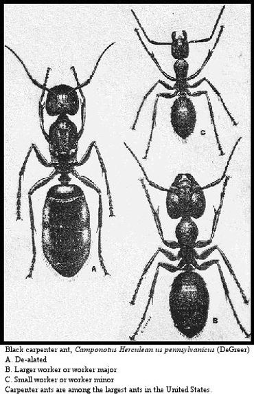 These long-legged; swiftly moving creatures are among our largest ants, which often invade homes foraging for food or for nest building. The workers are highly polymorphic, that is they vary greatly in size ranging from 1/4 inch to more than 3/4 inch. The queens may be more than1/2 inch long. The black carpenter ant, Camponotus pennsylvanicus (DeGeer), is the most common carpenter ant in the eastern states. It is a dull black color with an abdomen covered with long yellowish hairs pressed against the body surface.